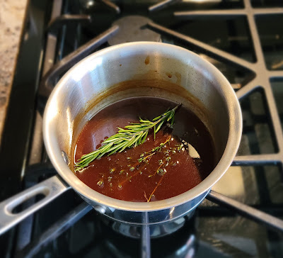 To dress the sweetbreads, we prepared a silky, rich sweet & sour sauce consisting of veal demi-glace, red wine vinegar, apple cider, butter, and a quick infusion of fresh thyme and rosemary.